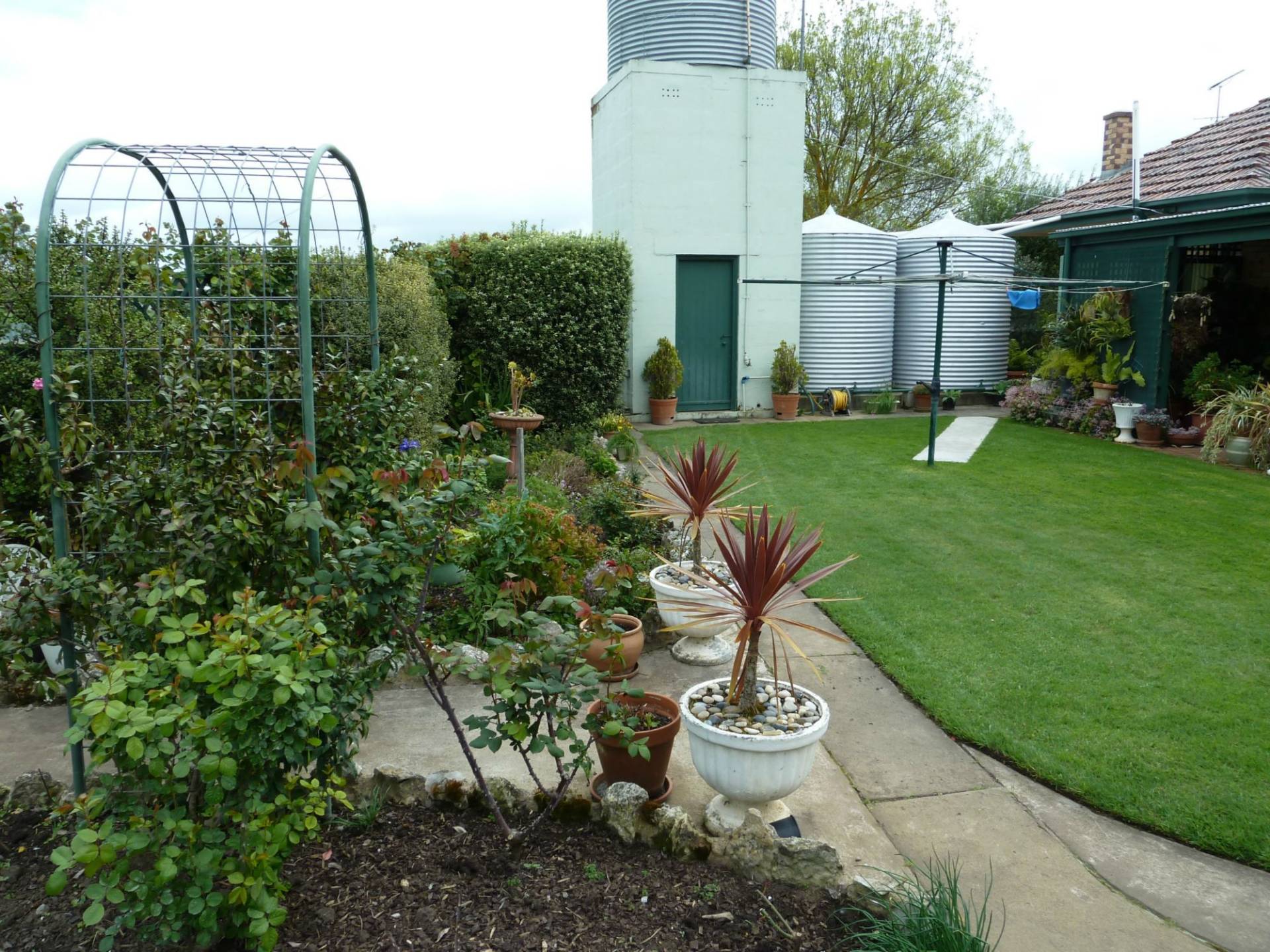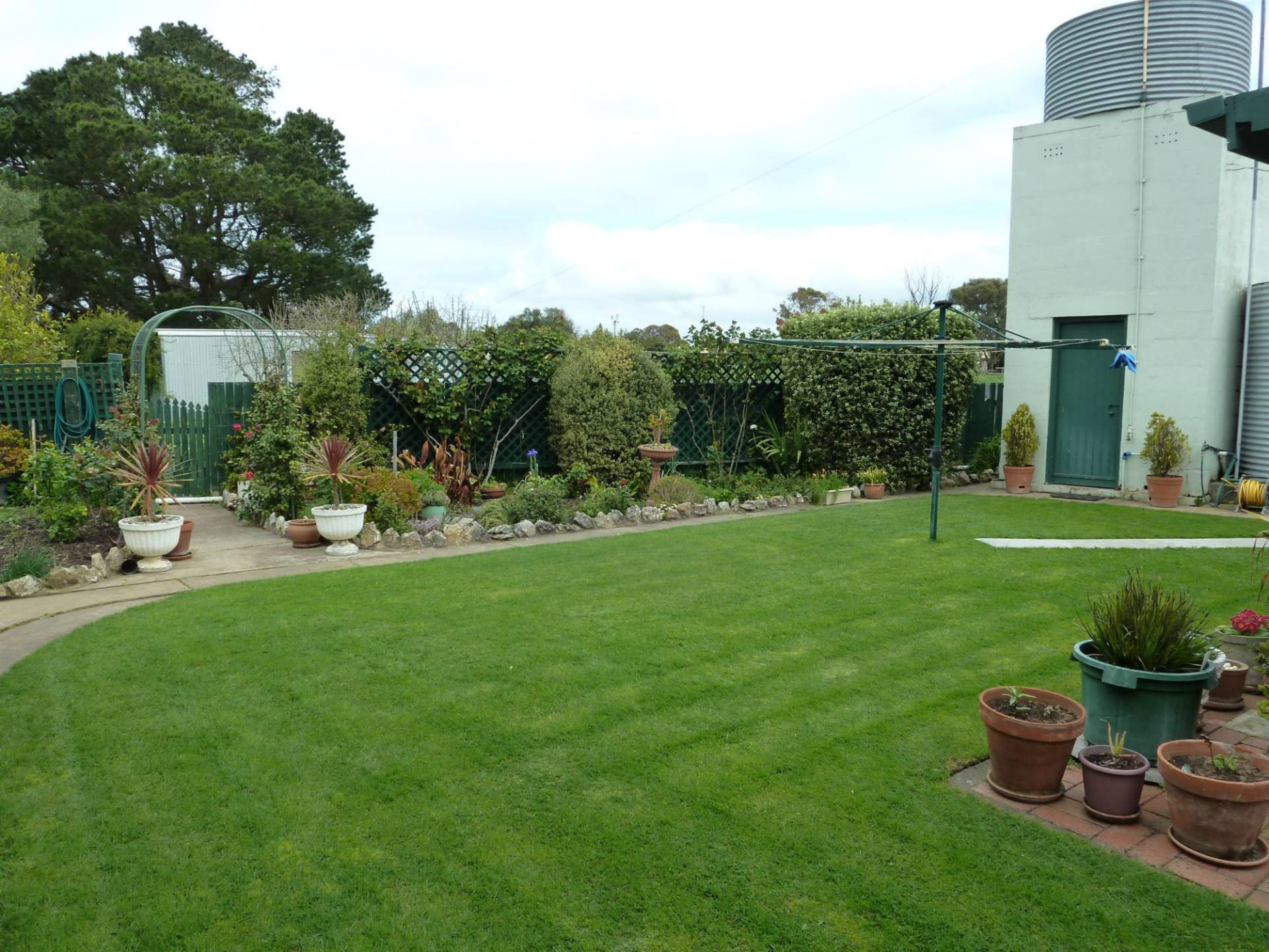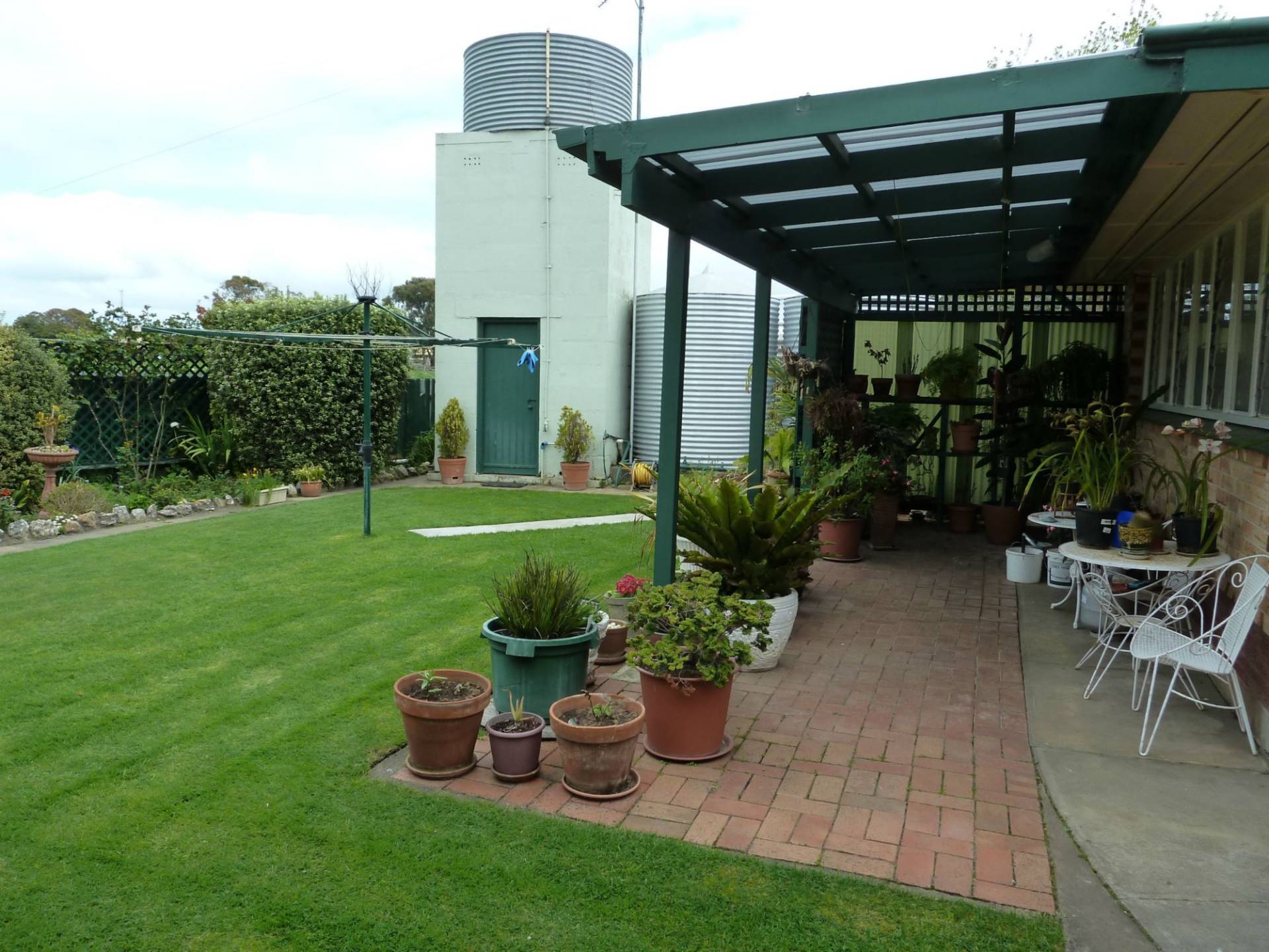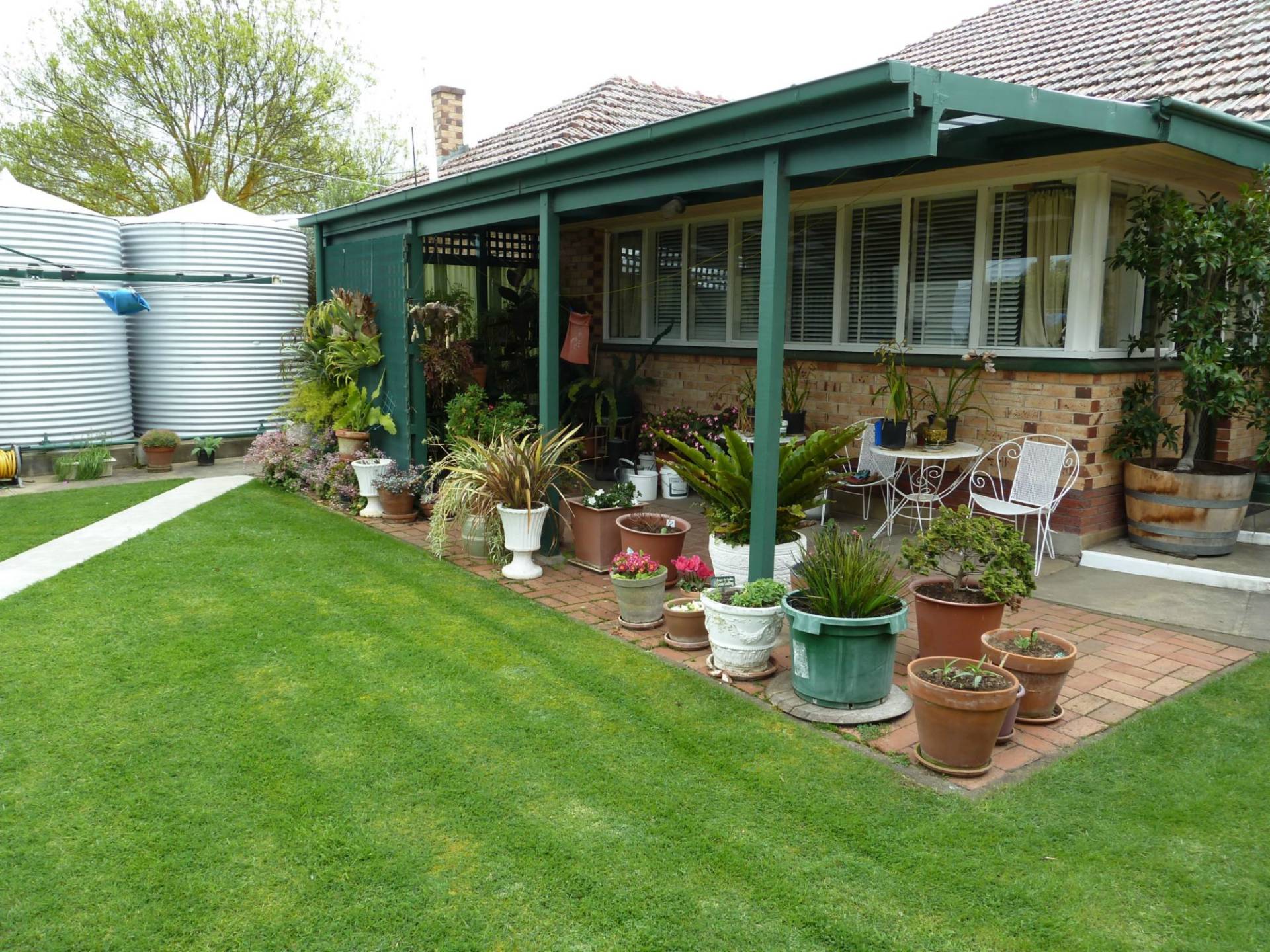 Outside features a double garage, rear patio, small garden shed, approx 40,000lts of rainwater plumbed to the house and a fully equipped bore connected to the pop up sprinkler system and watering lines.