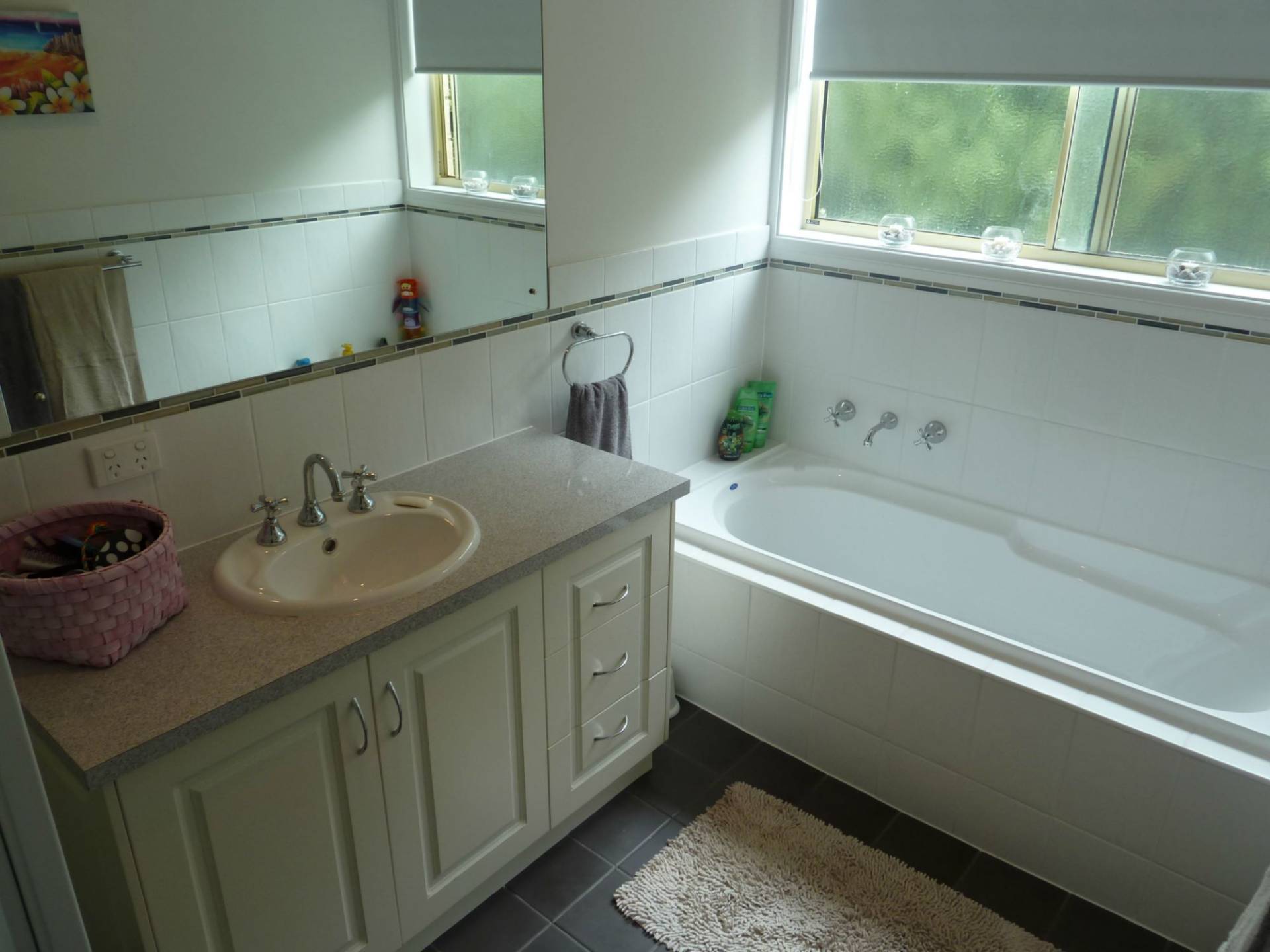 The main bathroom features tiled floors and wet areas with feature tile band, shower, bath and vanity.