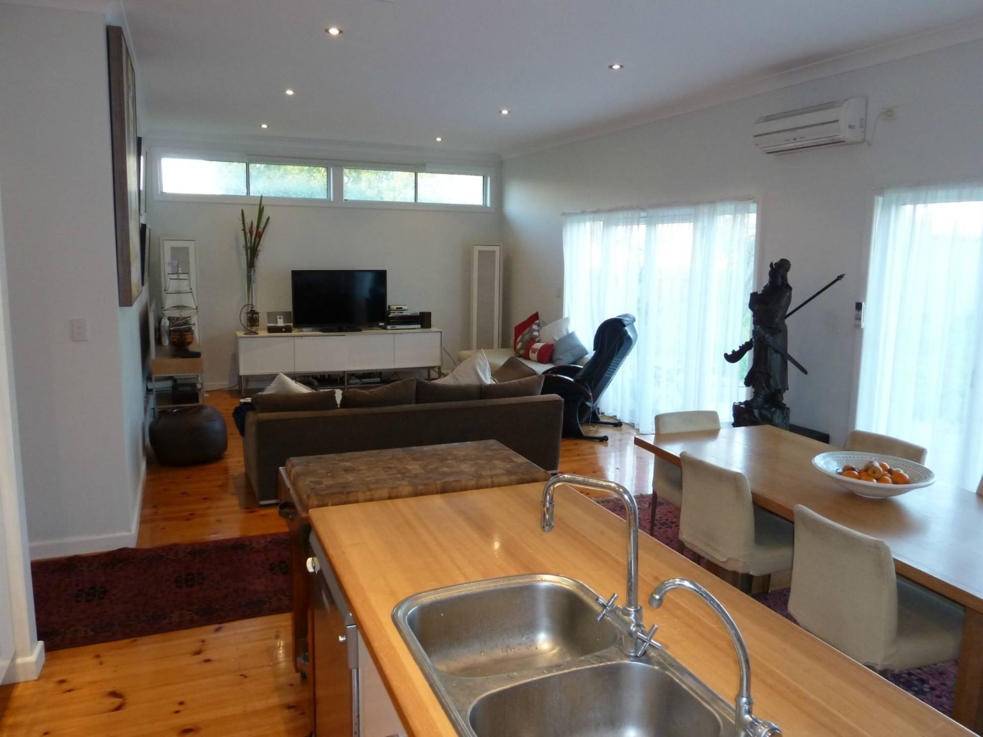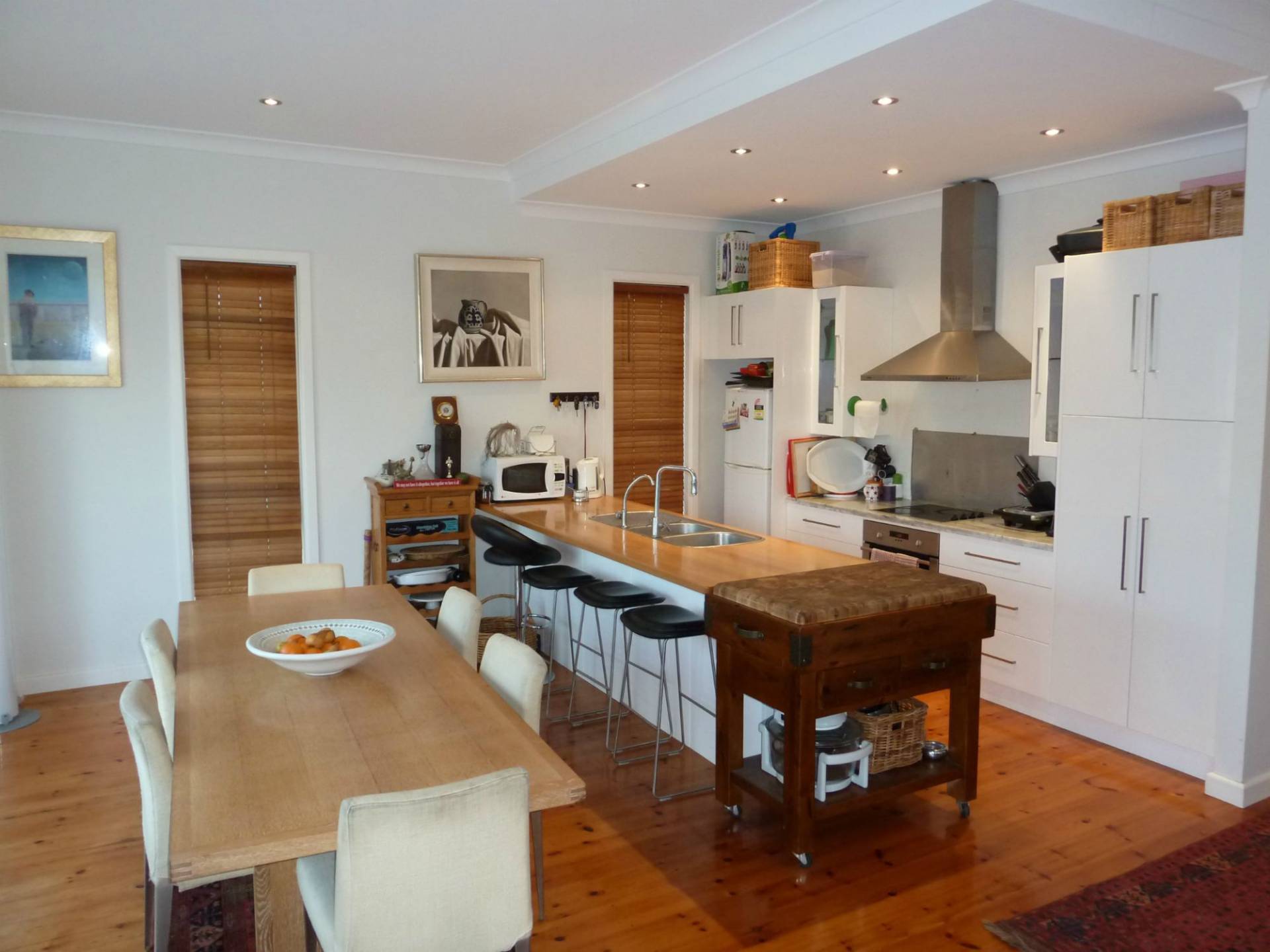Modern kitchen with electric oven, stove top, dishwasher and breakfast bench. Dining area which opens to outside and adjoins the open plan living room which opens also to the large back yard.
