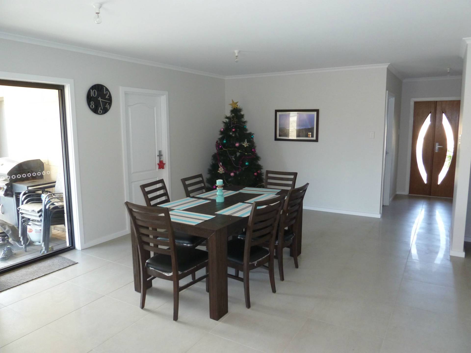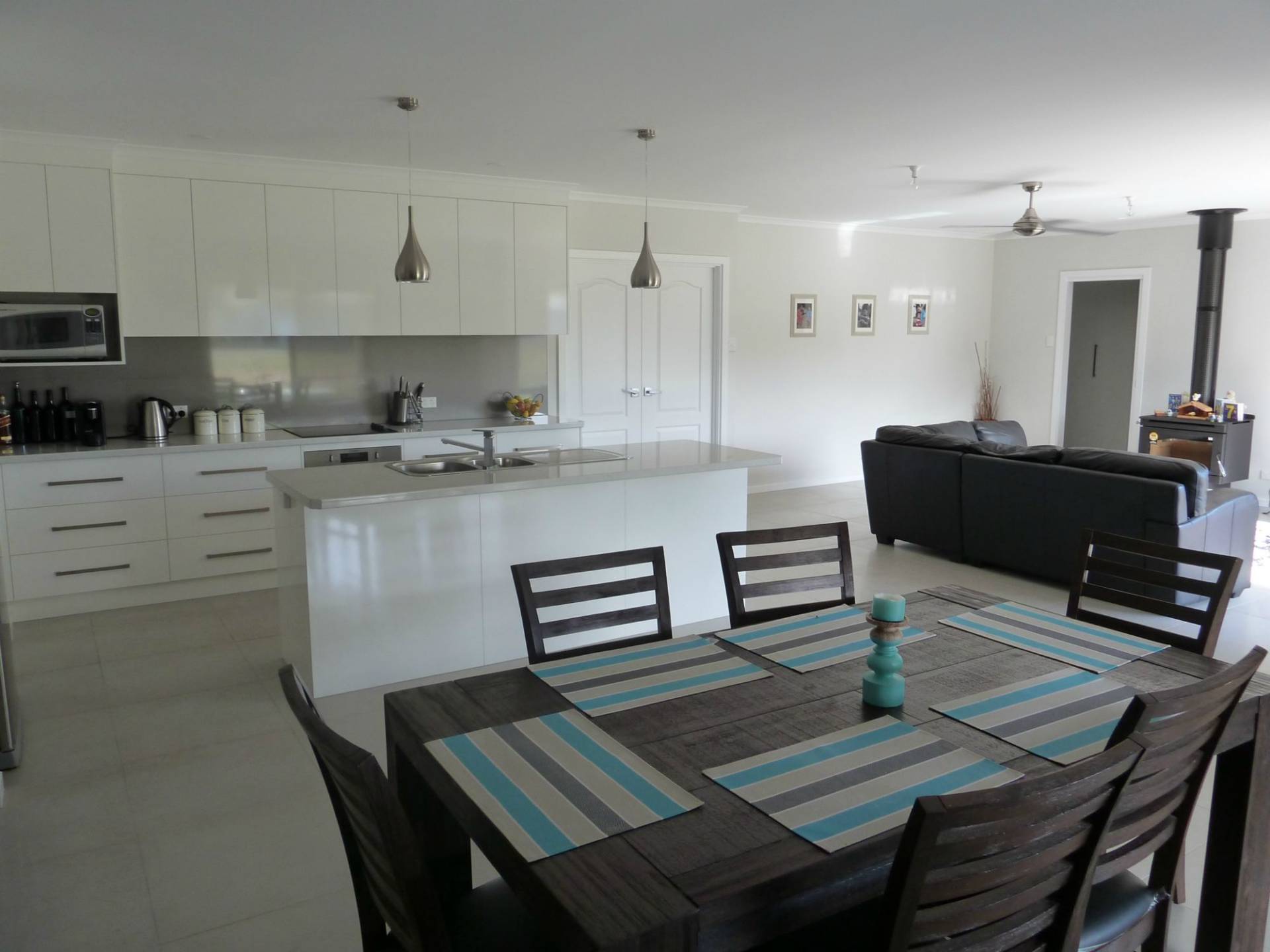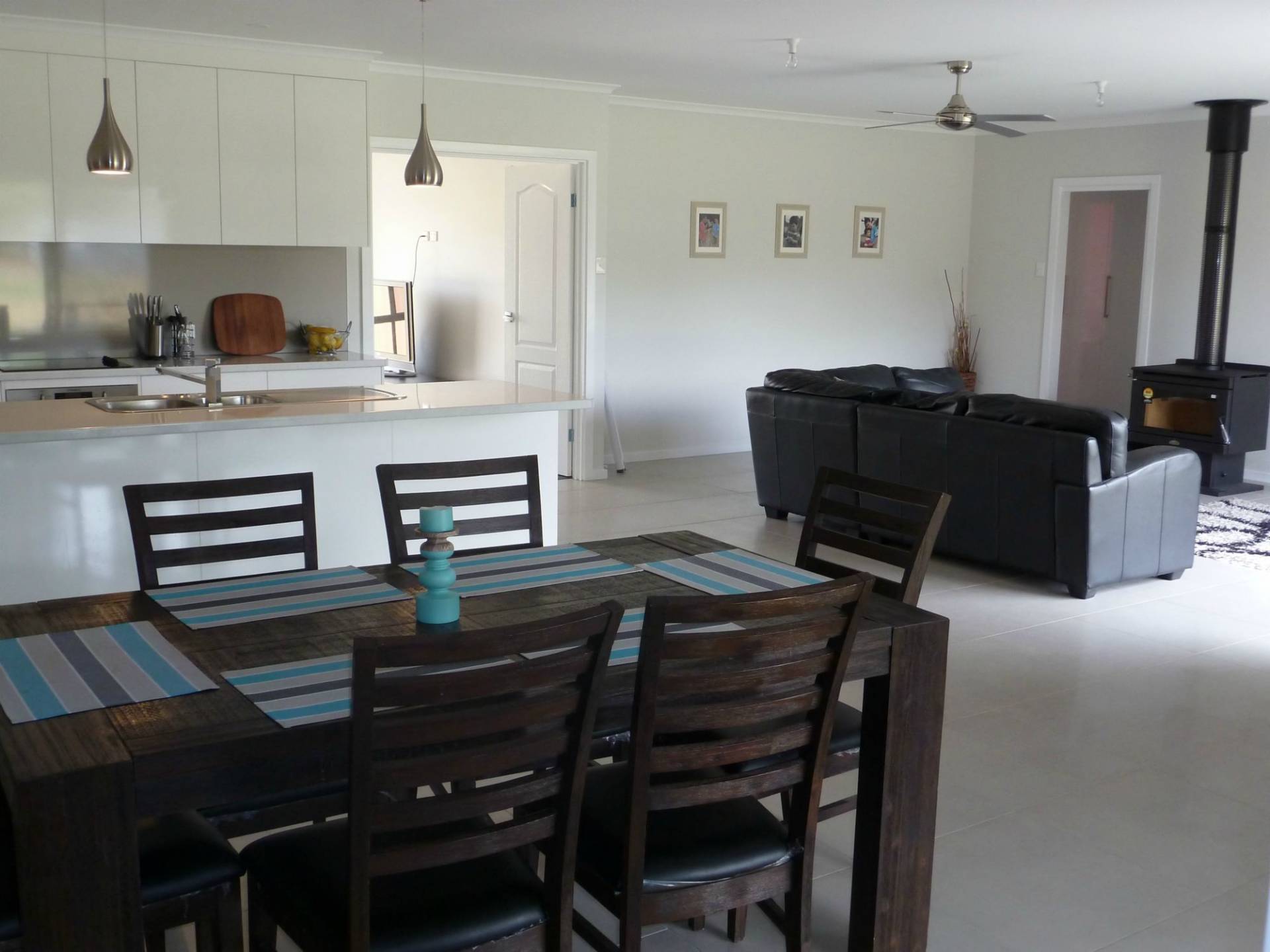 Features large open plan living area with tiled floors throughout kitchen and dining, wood heater, pantry, breakfast bar and electric appliances.