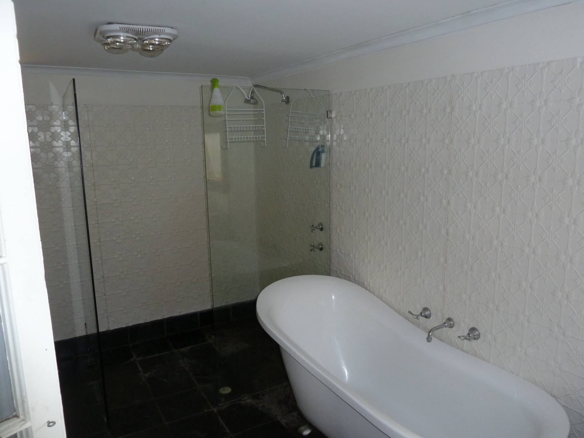 The bathroom features attractive pressed tin feature walls and large antique style feature bath and a shower recess.