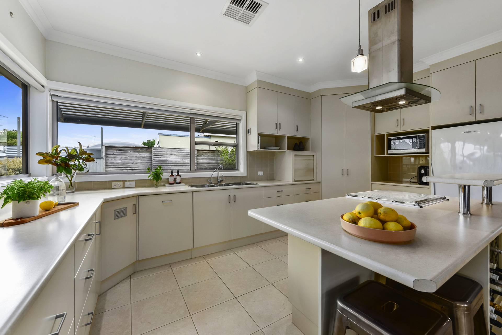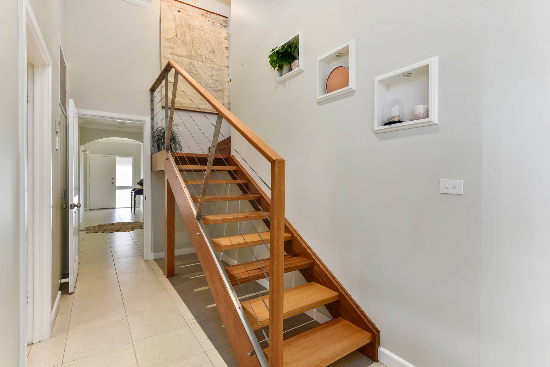 The well-equipped kitchen features dishwasher and gas cooktop perfect for the entertainer. Off to the side of the open plan area is an office, and a stunning timber staircase – a real feature – leading up to a bedroom.