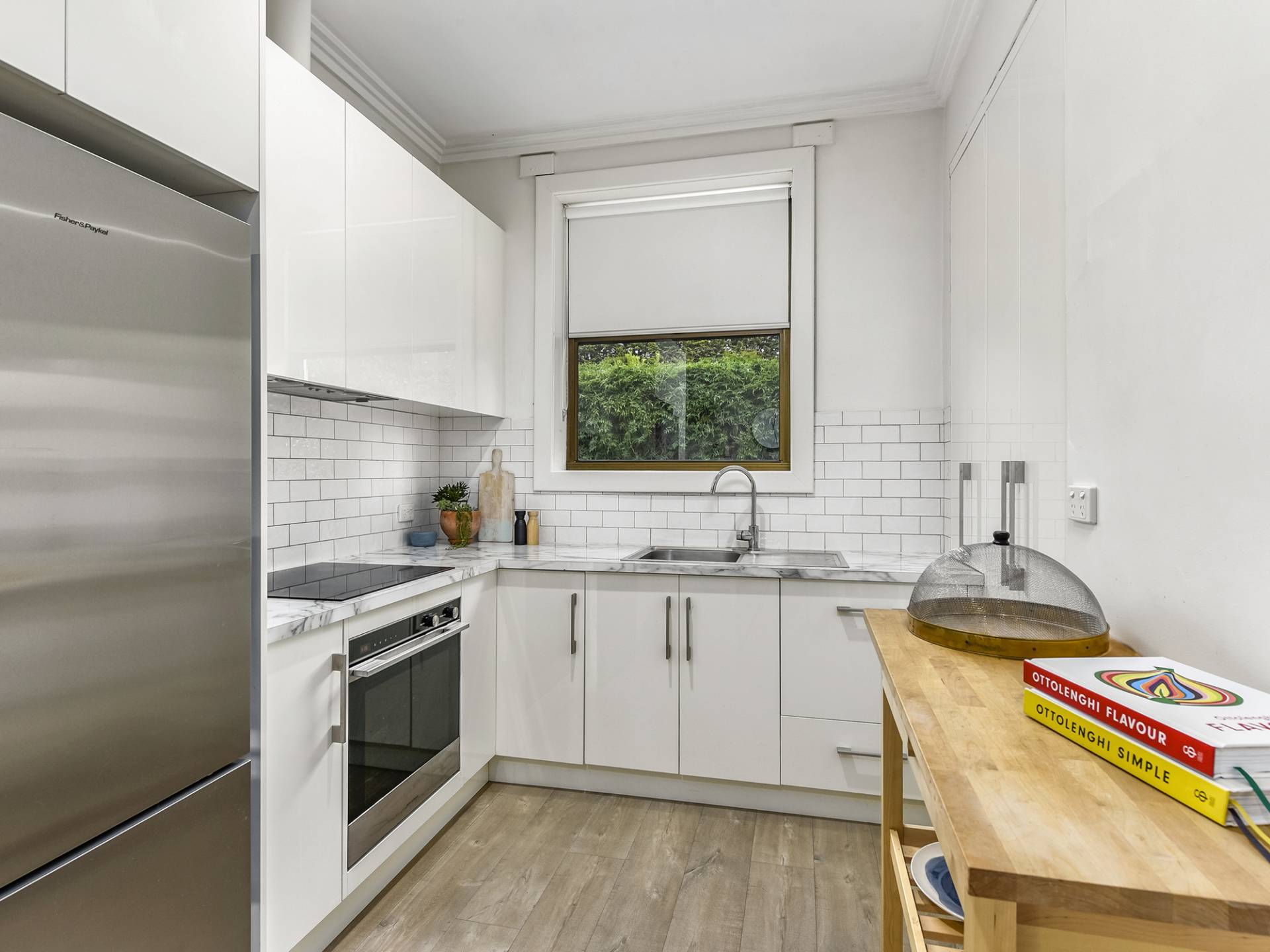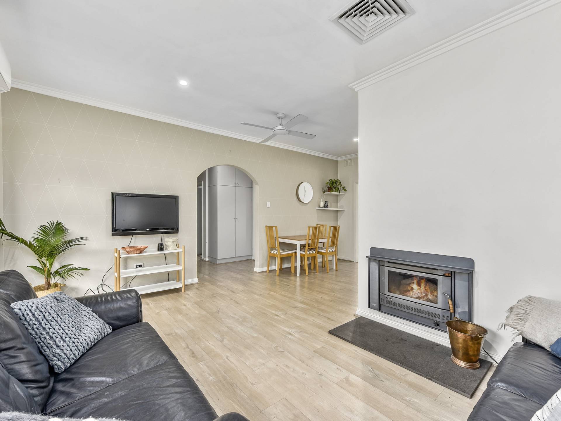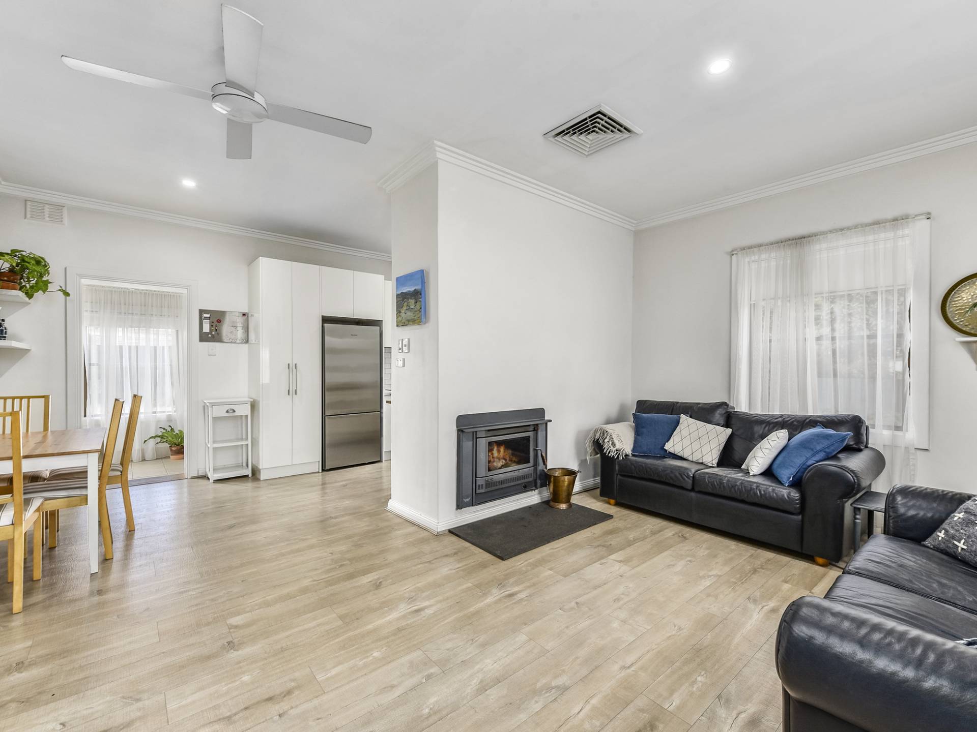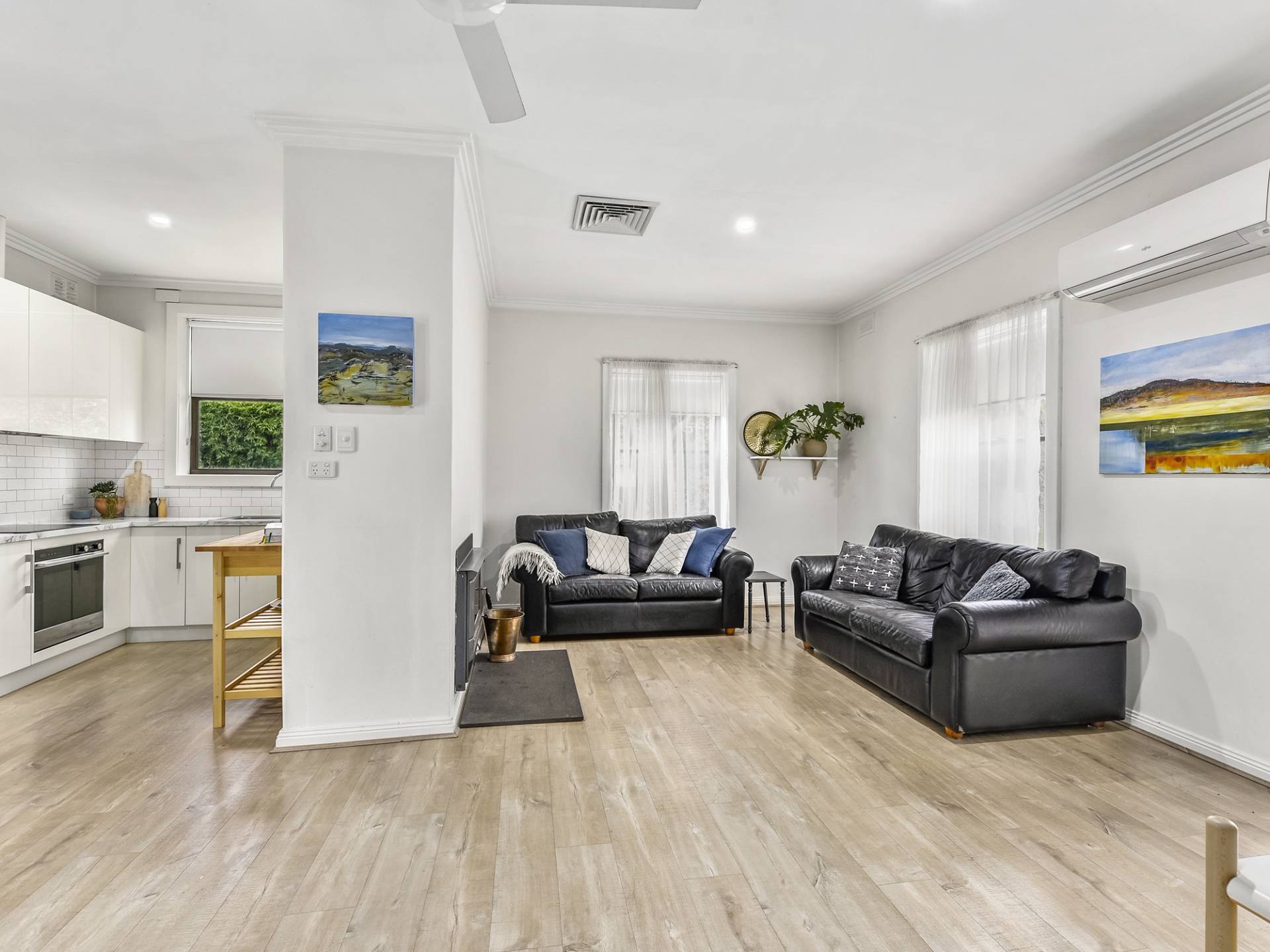 The interior has been beautifully renovated with a largely neutral colour pallet throughout. An open plan living, kitchen & dining area, downlights, timber look flooring, and a subtle abstract feature wall have given this cottage a contemporary feel. The kitchen is soo well done; Marble look benchtop, gloss cabinetry and white subway tiles make a stylish and timeless combination. Practically, there are clever space saving techniques at play including an integrated dish-drawer.