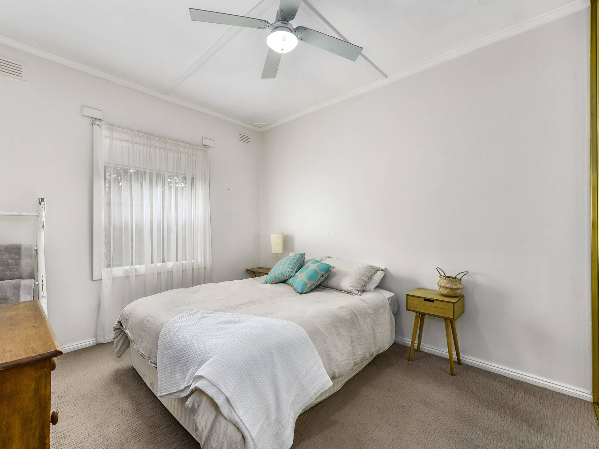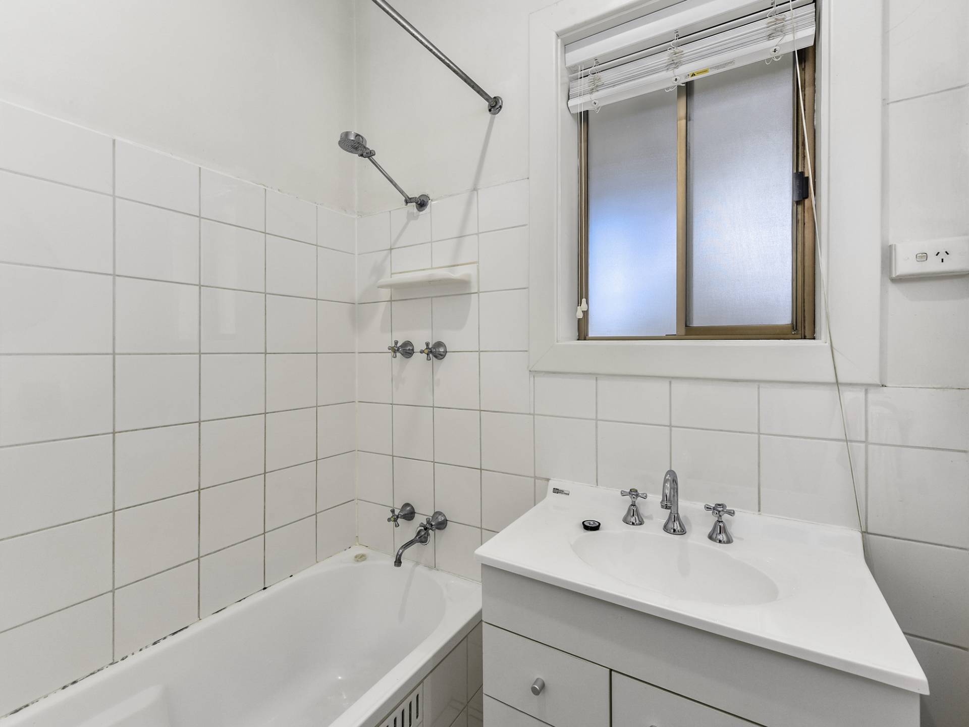 Extending from the main space, through a wide archway can be found 3 good sized bedrooms, with the main having a mirrored built-in cupboard. A bathroom has been updated from the original and features a shower over bath and vanity.