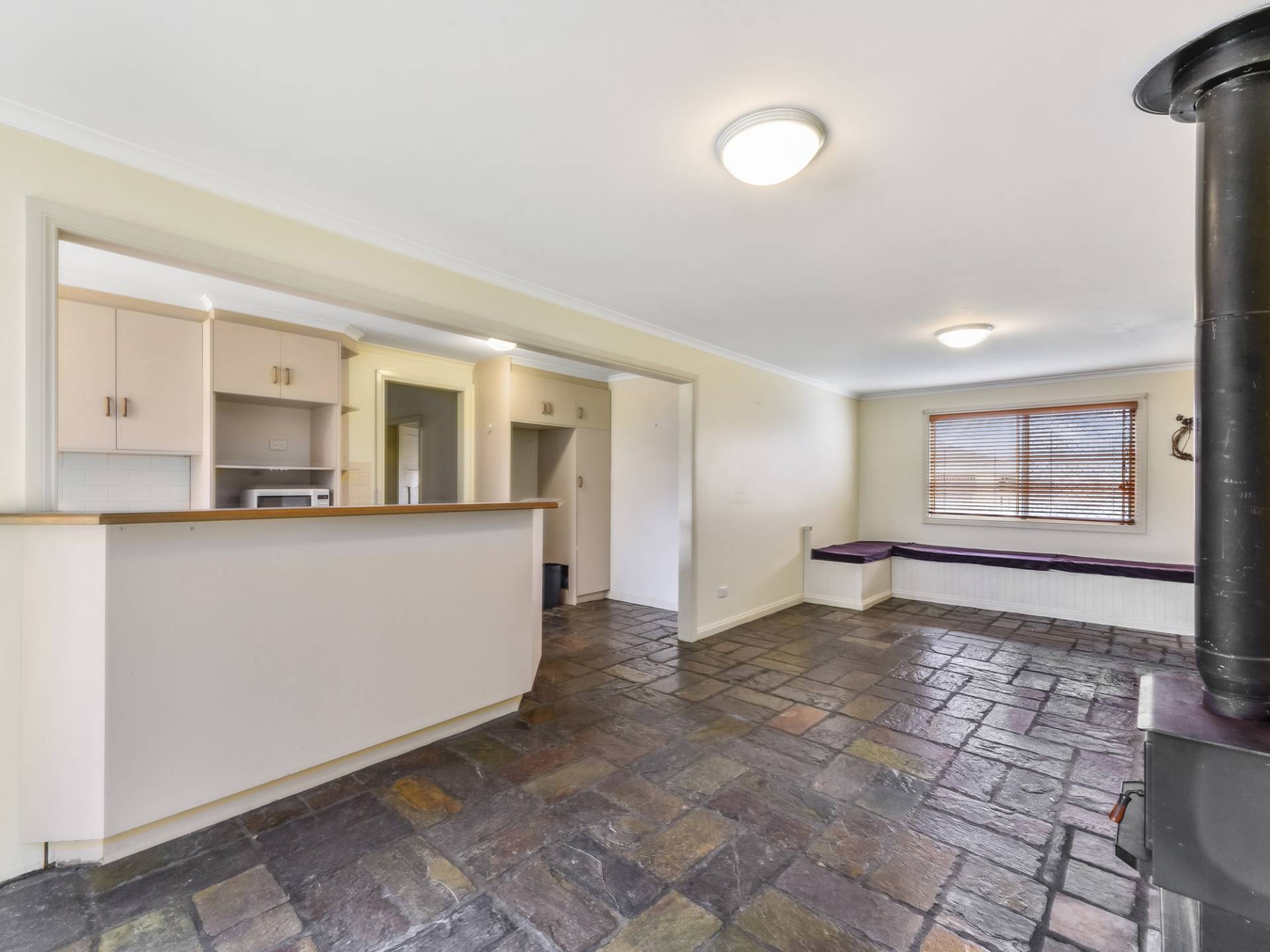 • The middle section of the house – bridging together the original cottage and the rear stone section of the home. This is the informal entry from the parking spaces – the part of the house you linger in and interact with the rest of the family. Here, an elongated kitchen with gas cooktop and dishwasher, dining space with built in seating and slow combustion fireplace.