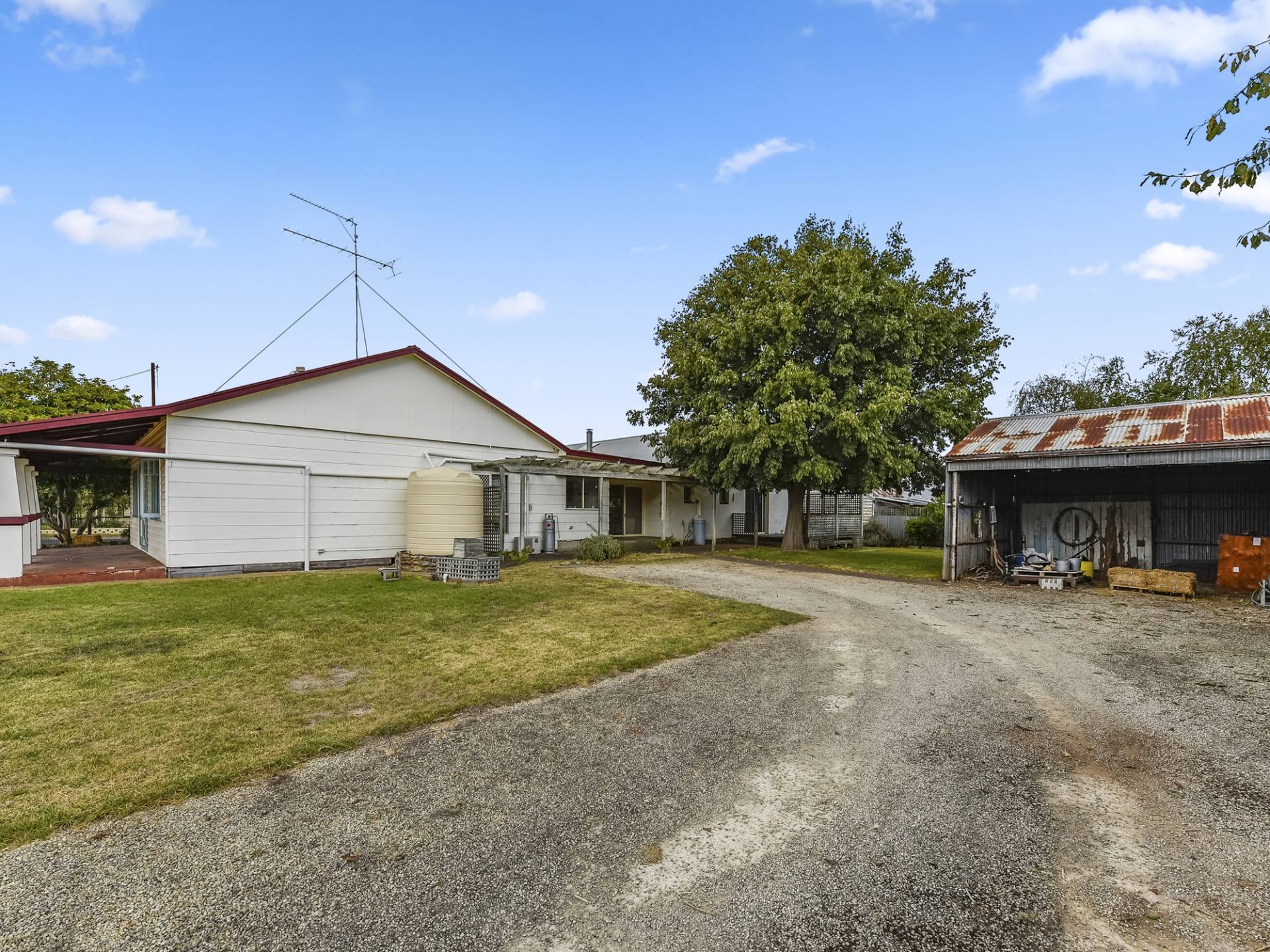 Outside offers a timber framed deck double shed and graveled driveway / off street parking.