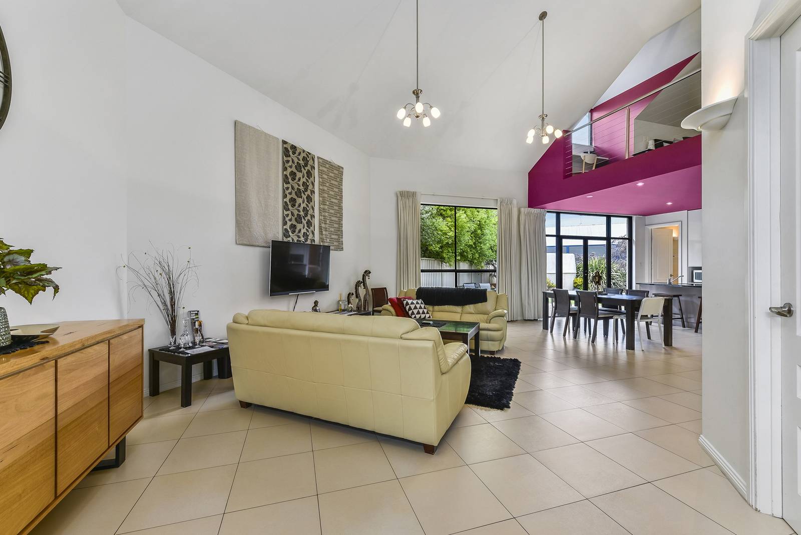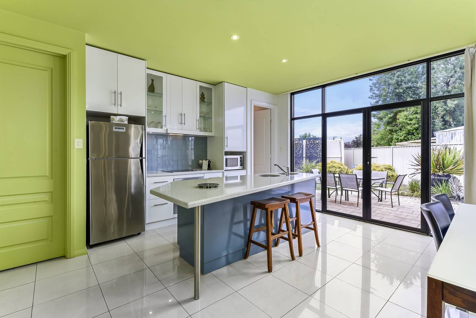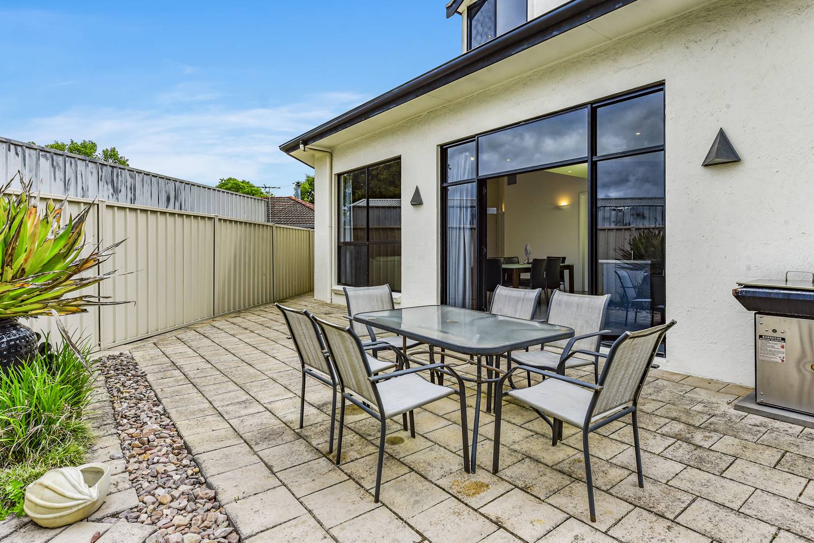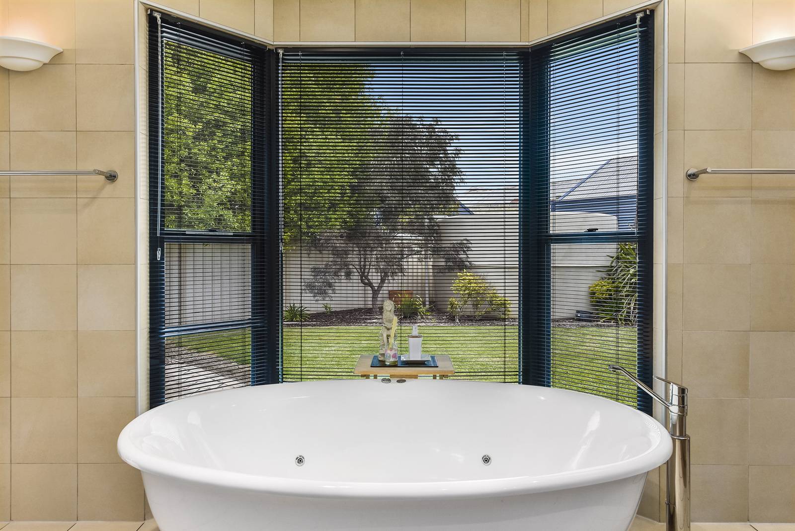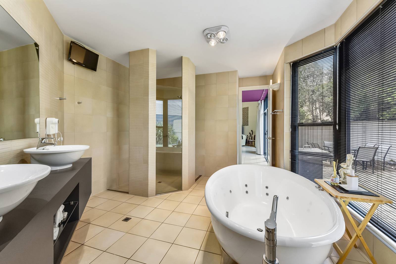 On the ground floor are two private bedrooms, the first with a queen size bed and the second with a king. Open plan lounge and dining, second sparkling bathroom which is adorned with an indulgent freestanding spa bath, double basins and a double shower.  Step outdoors for private entertaining areas, lawn & garden. Rainwater throughout.
