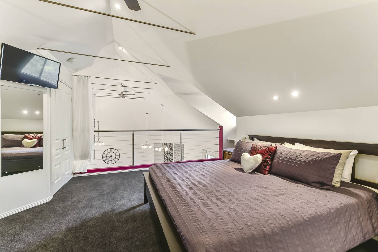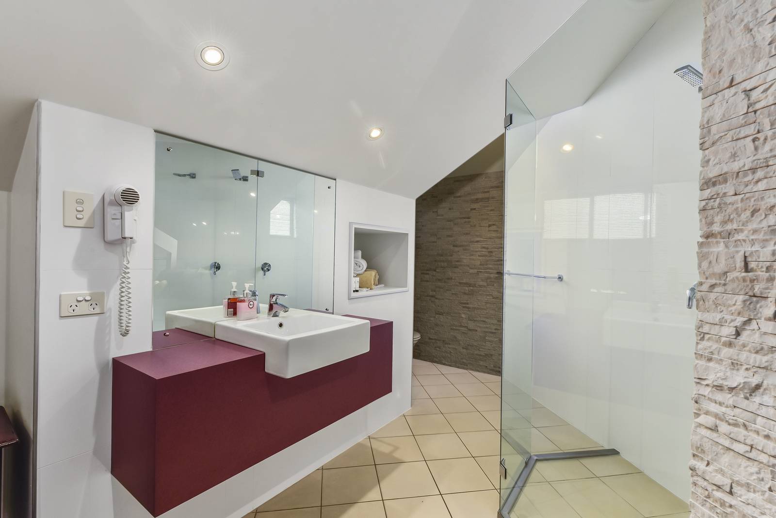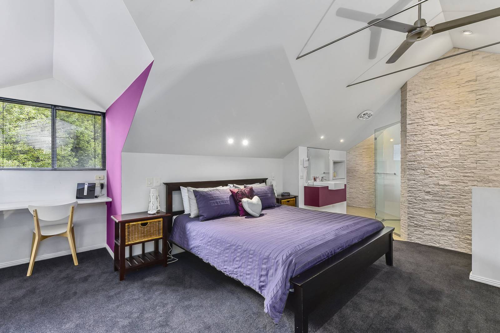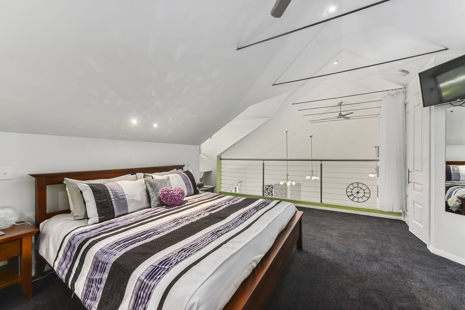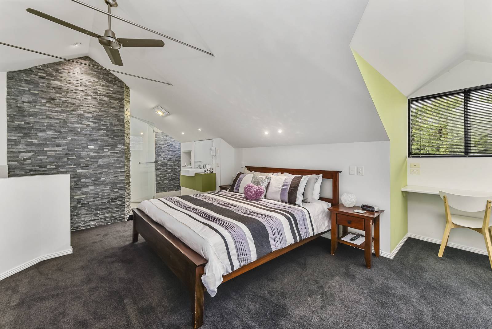 The residences' display a striking maroon and light green influence throughout their individual design and fitout. The fully self-contained kitchen and open plan living are spacious and offer a perfect, modern entertaining or relaxation space. The master bedroom is situated on a unique mezzanine level featuring a king size bed, a private ensuite featuring a double rainfall shower and large walk-in robe.