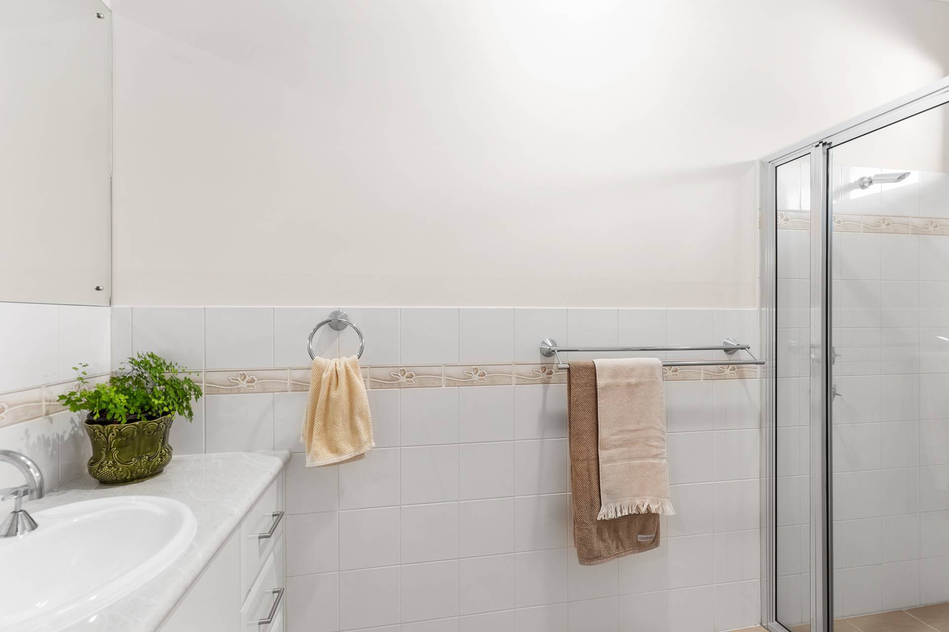 Venture a little further into the house and come to the generous open plan living, kitchen and dining area. If you can peel yourself away from the views at the front of the property, this is where you’ll be, in the hub of the home. The kitchen is packed with features – walk in pantry, dishwasher, in wall oven, breakfast nook and a plethora of storage. There is a sense of spaciousness, and a real connection to the landscaped garden outside. A host of north facing glazed windows and sliding doors connect out to a large outdoor entertaining area. Perfect for entertaining, year-round, with the benefit of roller blinds to protect you from the southerly breeze.