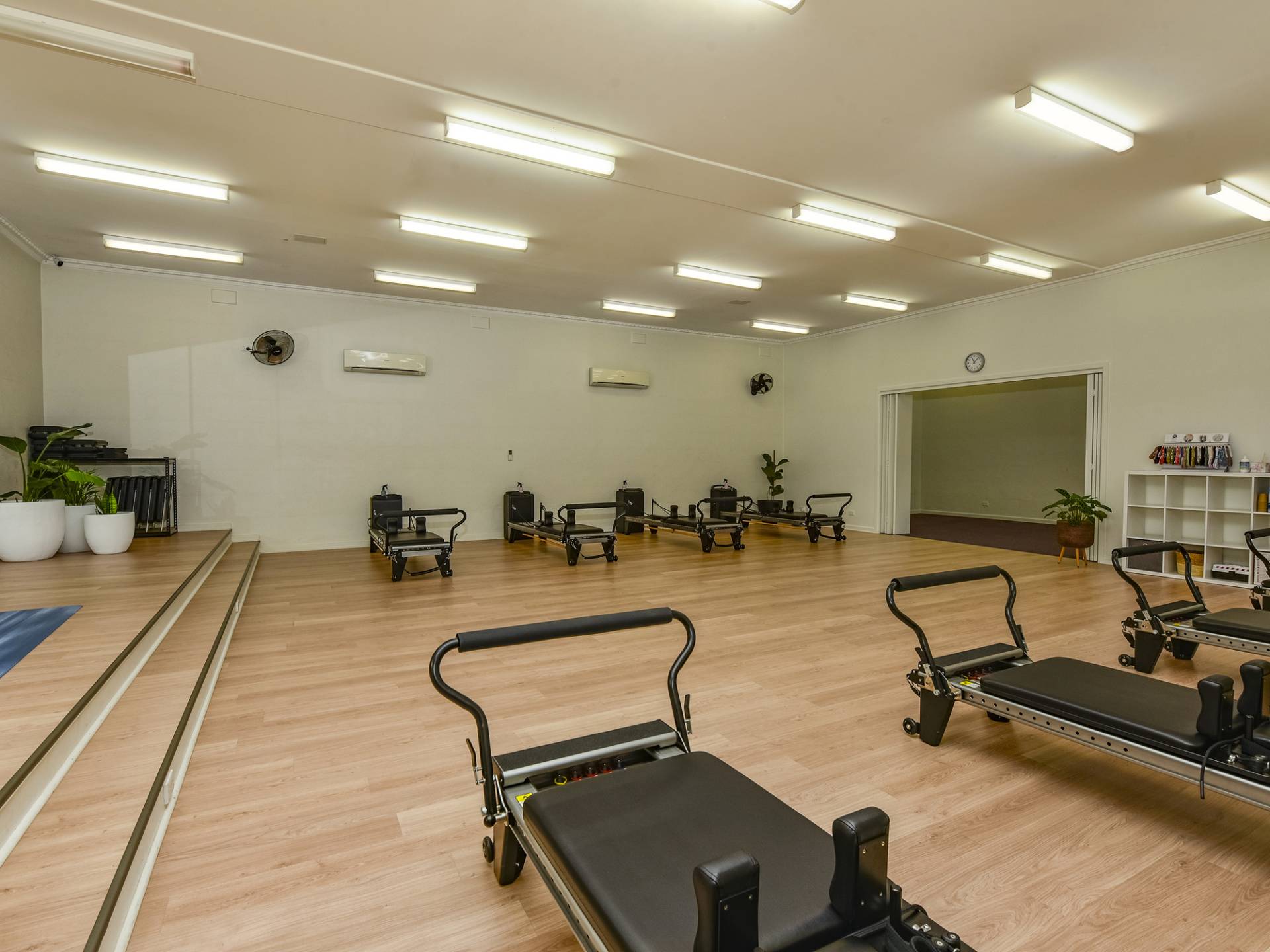 At the rear of the building, a vast studio is presently occupied by a popular pilates business. Adjacent to it, you'll find smaller breakout rooms, ideal for personalised consultations or intimate fitness classes. This area also features well-maintained toilet facilities, ensuring both comfort and functionality.