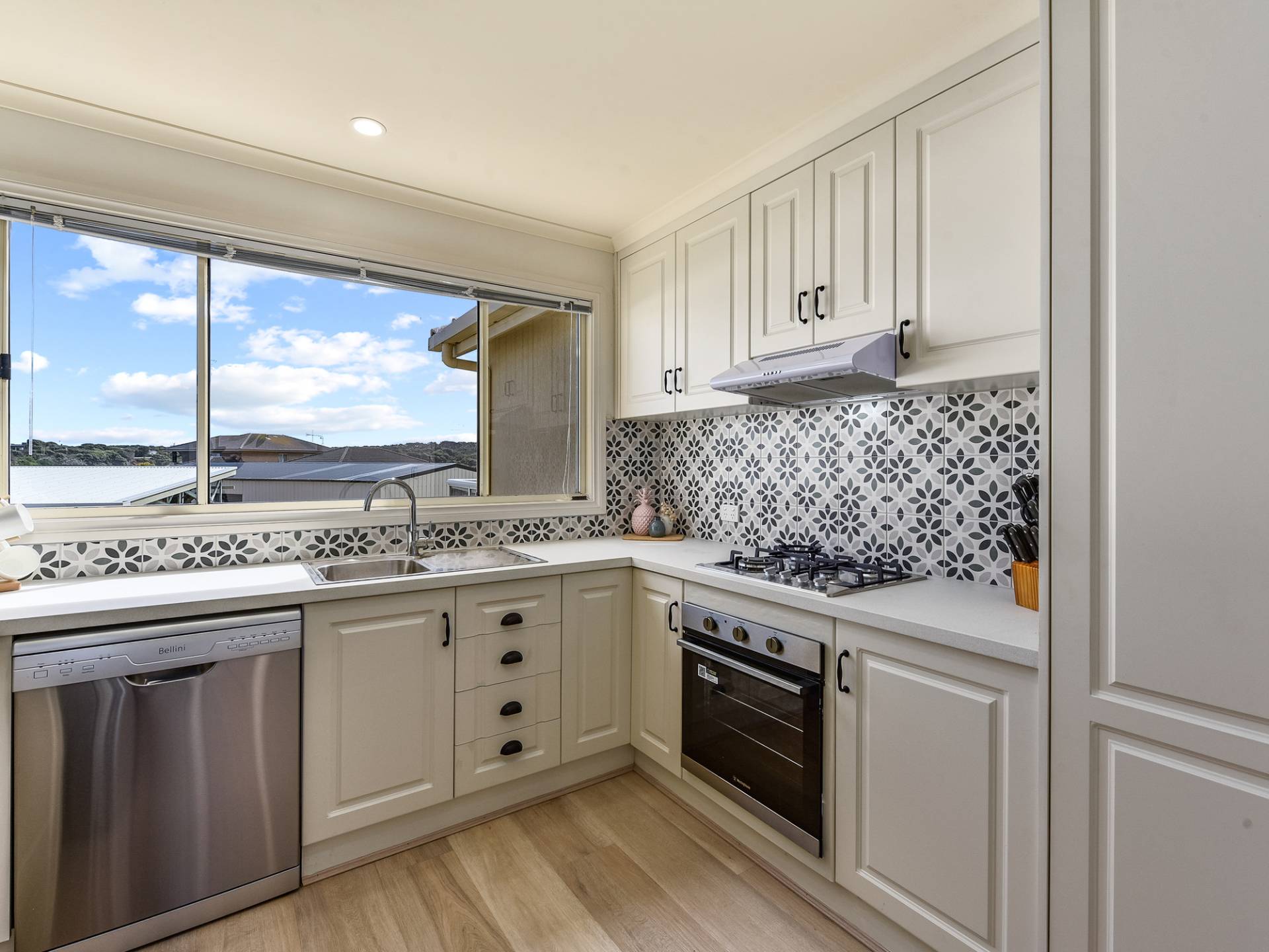 The contemporary open plan living area offers an abundance on natural light and neutral tones, with cosy lounge area complemented by good sized dining area and split system air conditioning. The modern kitchen offers Lighthouse views, dishwasher, gas cooking, ample storage (with pantry and additional large walk in pantry) and feature splashback tiles.