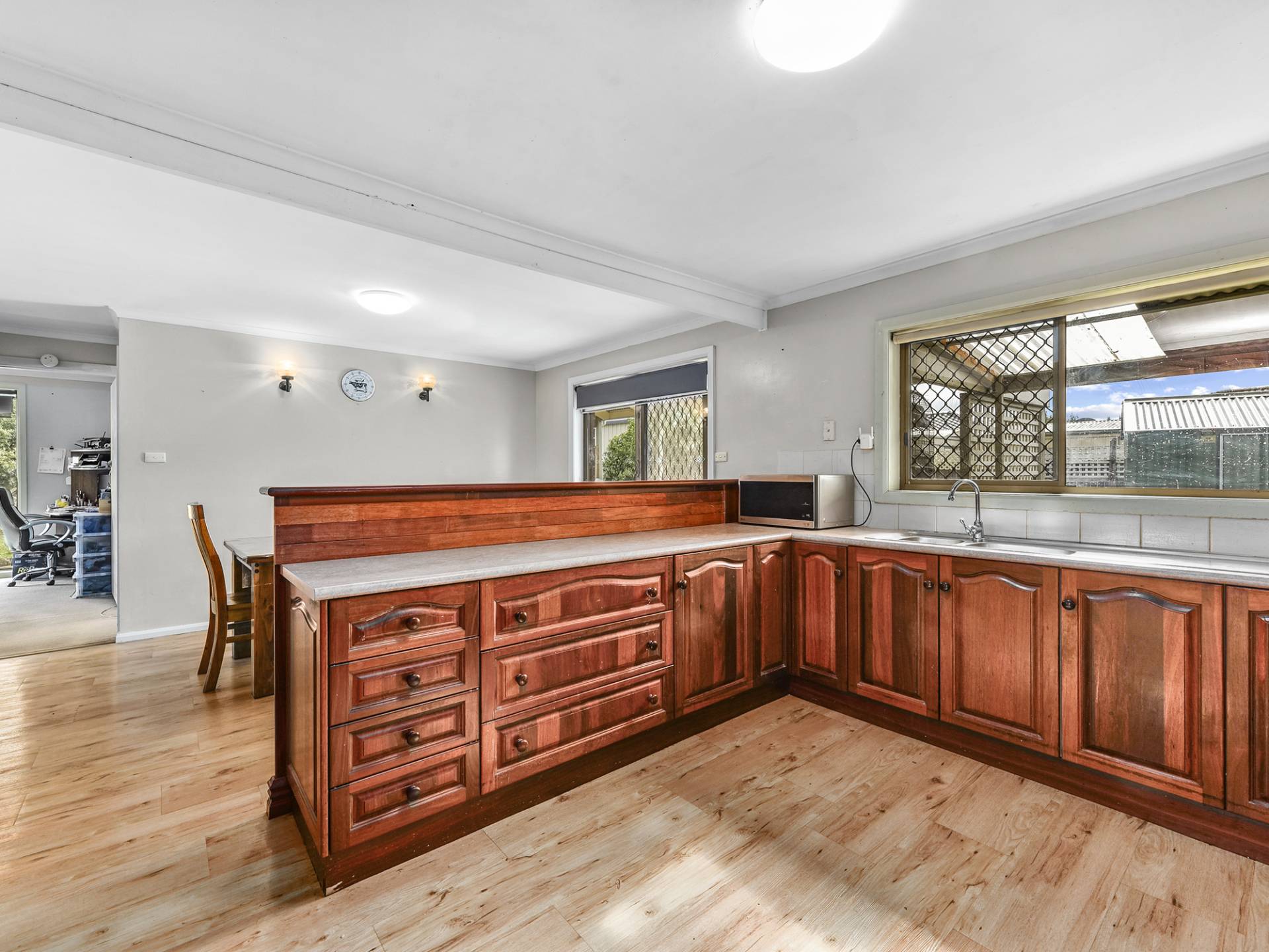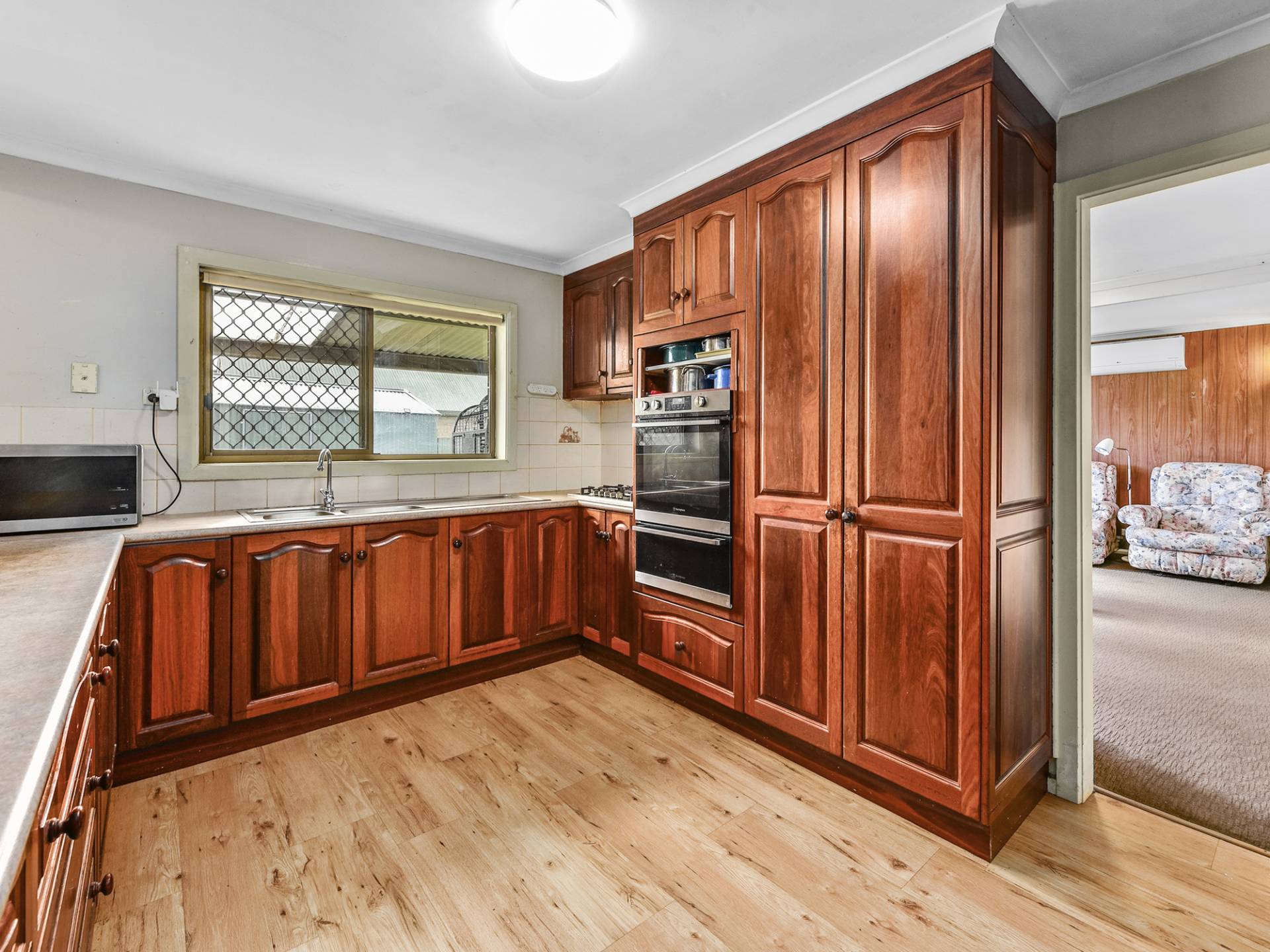 Step inside the home to an inviting living area, flooded with natural light streaming through the North facing windows. Stay comfortable year-round with the convenience of a split system air conditioner and gas heating system. The open-plan country style kitchen and dining area is the heart of the home and perfect for family gatherings, boasting ample bench space, storage, in-wall oven and gas cooking. This area extends to a fantastic outdoor entertaining space, ideal for alfresco dining and enjoying the serene established garden.