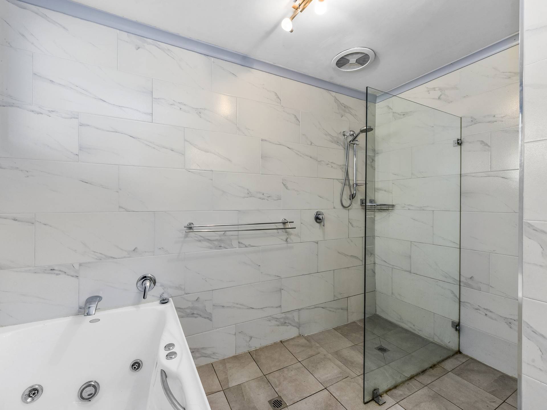 The bathroom offers floor to ceiling tiles, large bath, separate shower and toilet and adjoins the laundry with external access.