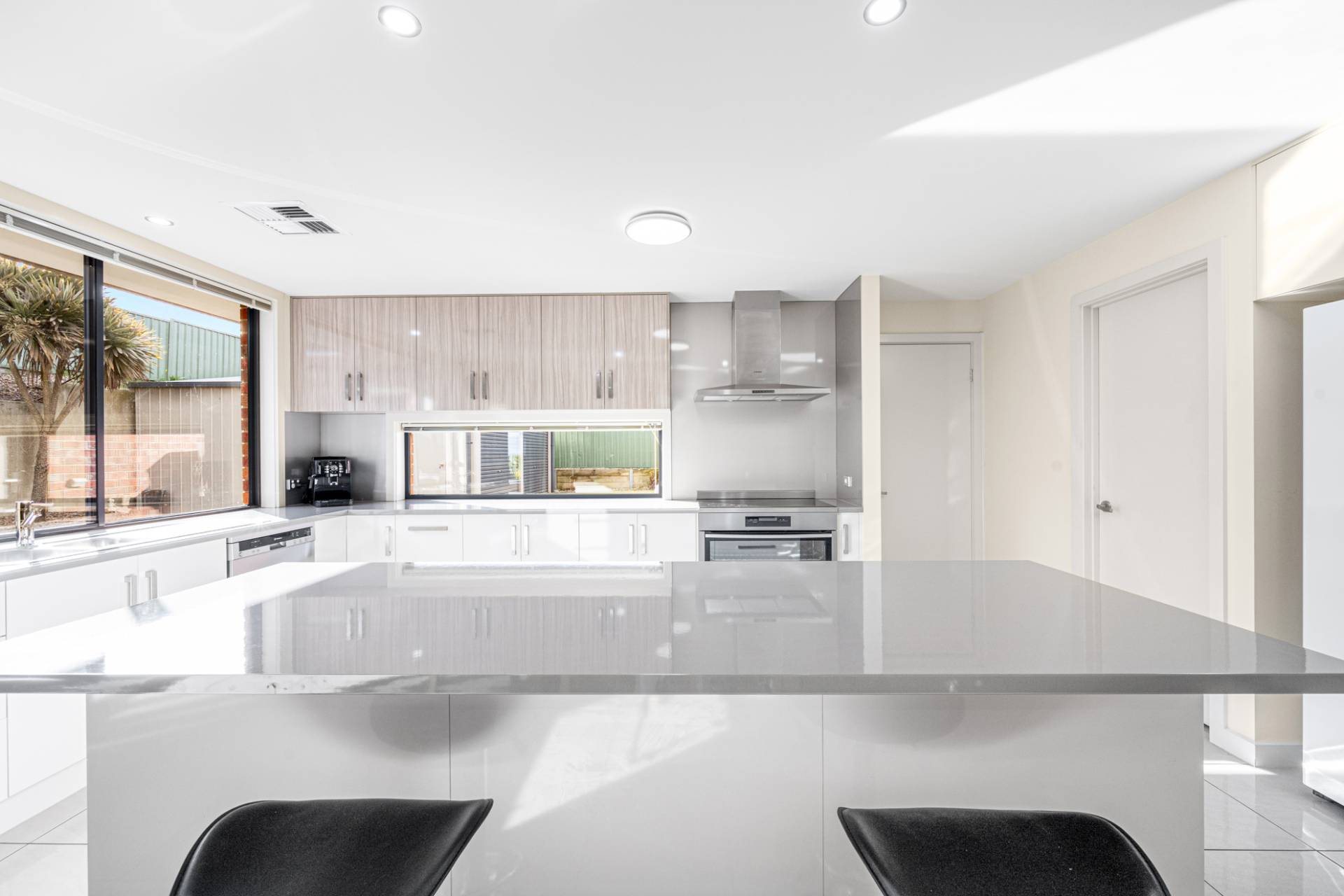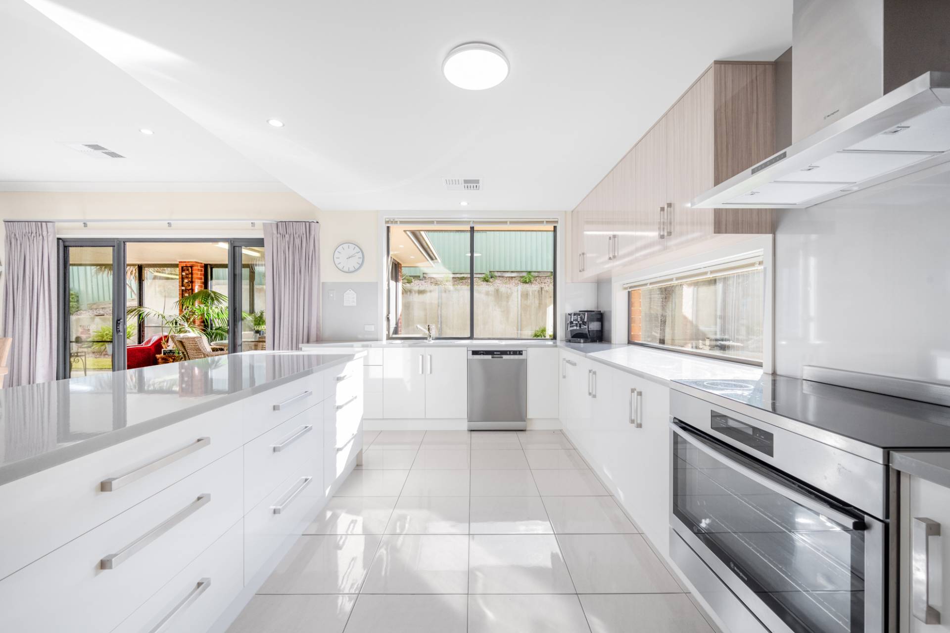 Elevated above street level, with wide street frontage, the home presents grand street appeal. Upon entry through the wide hallway, you’ll be greeted by the true heart of the home – an expansive light-filled open plan kitchen, living and dining area. The open concept kitchen has modern clean-look white gloss cabinetry with earth toned tiled back splash and bench top with two tone overhead cabinets, stainless steel appliances including 900mm glass top electric cooktop/oven + dishwasher and huge walk-in pantry. The kitchen adjoins a large dining and family area, with a second, more intimate formal lounge also on offer. You’ll also stay comfortable all year round with ‘touch of a button’ ducted reverse cycle air conditioning.