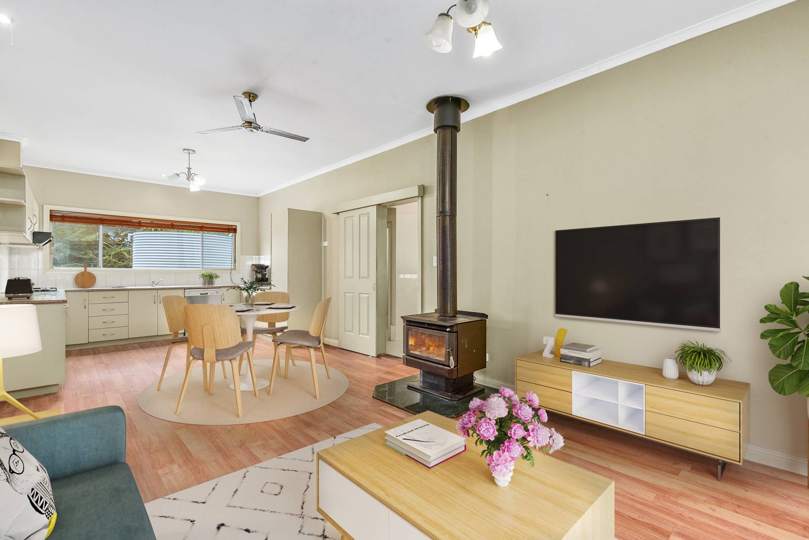 The home features three generously sized bedrooms, each equipped with built-in robes. The timber-look flooring throughout the home adds a warm and inviting feel. A recently renovated bathroom boasts both a separate bath and shower, with an adjoining separate toilet and laundry. The open-plan kitchen, living, and dining area provides a bright and airy space with beautiful rural views visible from the kitchen window. Direct access from the double bay high-clearance carport allows for ease of entry into the home.