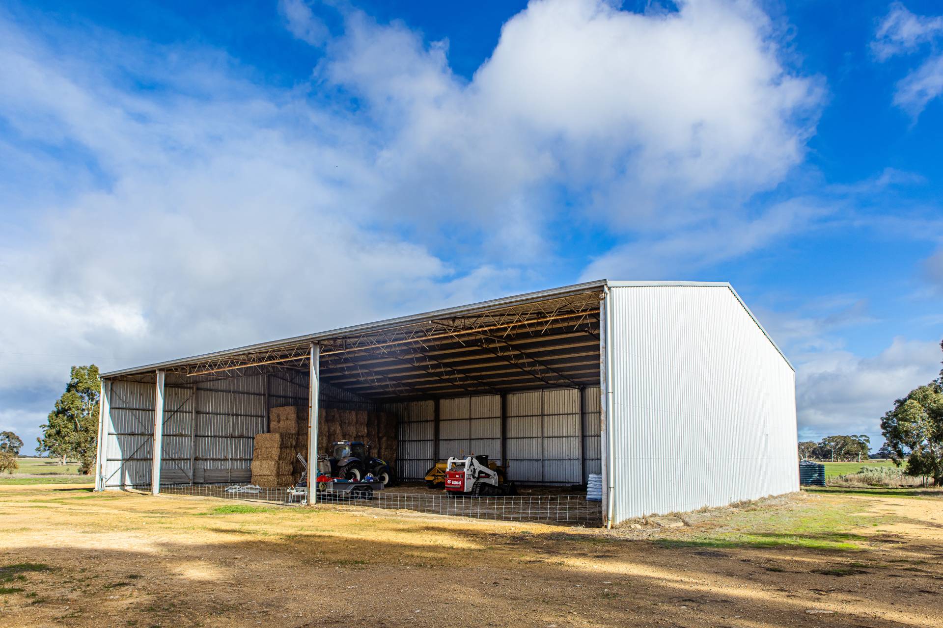“Karrallee” features fantastic shedding, including a new 405sqm high clearance shed with 150sqm enclosed with a concrete base. A 645sqm steel framed hay and further sundry shedding allows for the uncover storage of all fodder, plant and equipment.