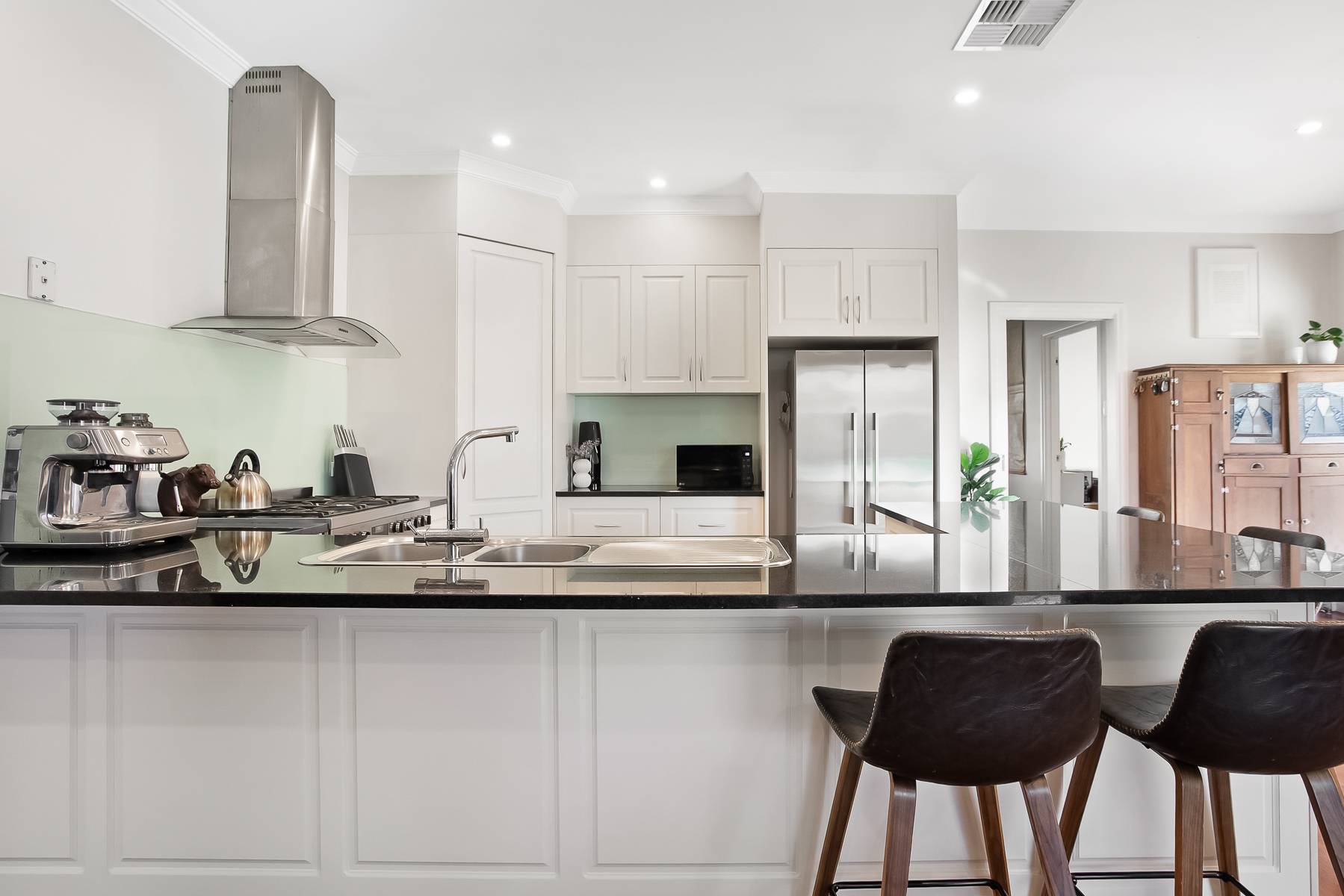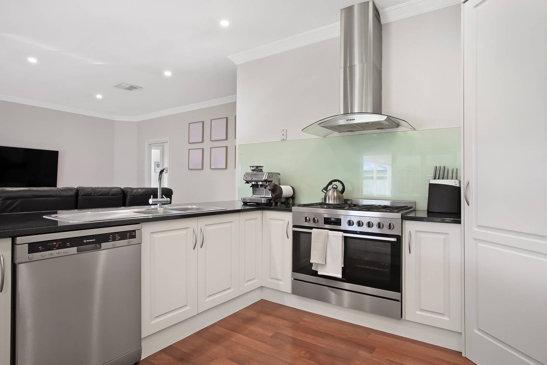 • Kitchen is equipped with sleek black stone benchtops, a 90cm oven with gas cooktop, dishwasher, and a practical corner pantry.
