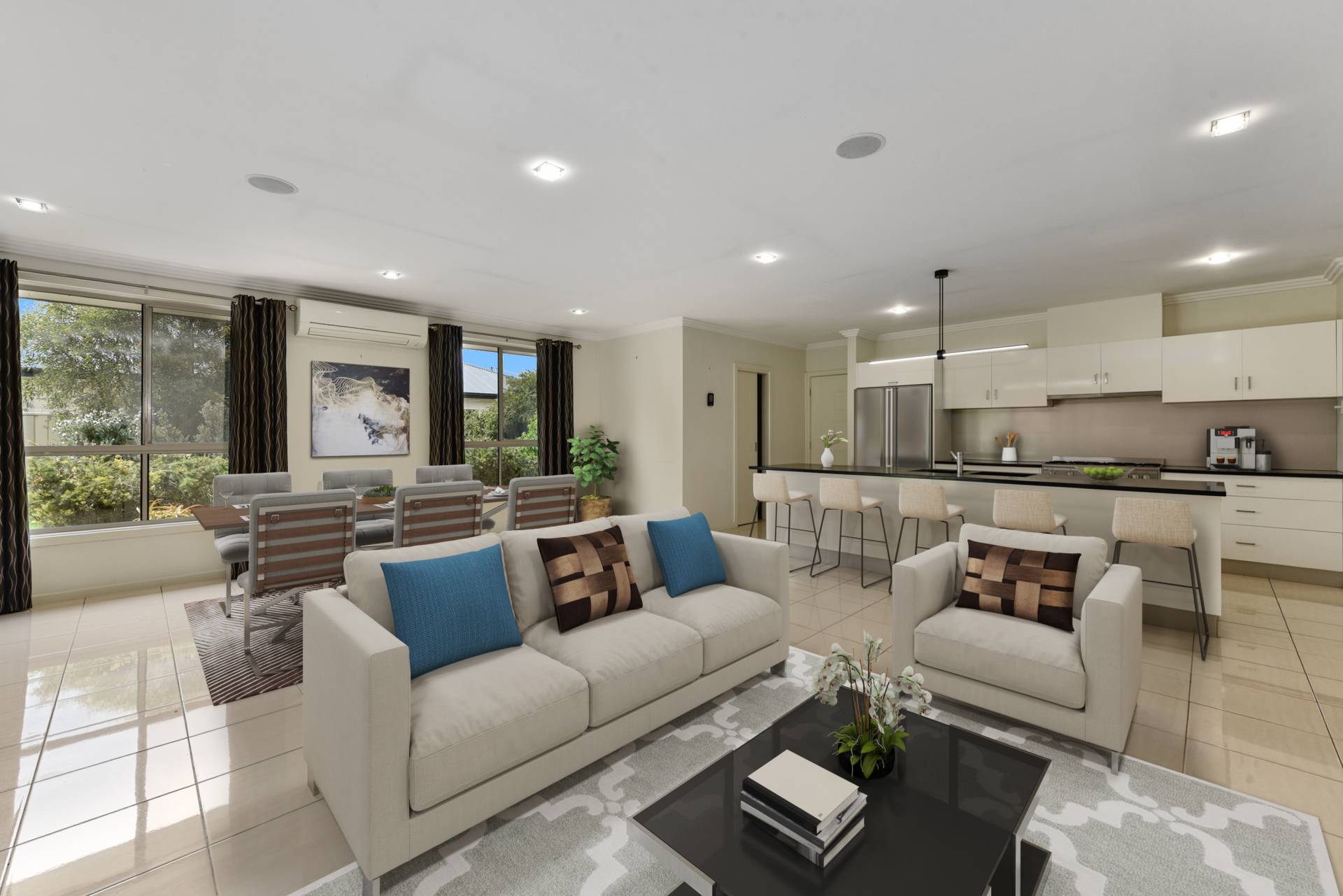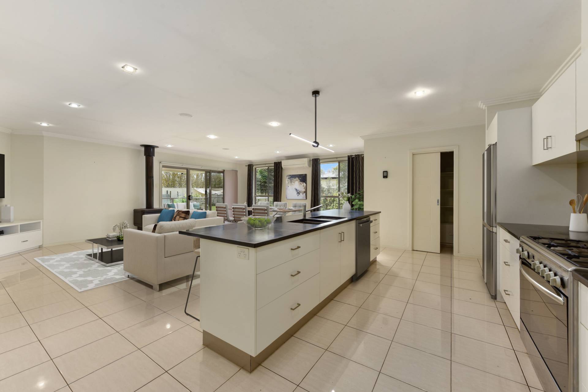 The heart of the home is the expansive open-plan kitchen, living, and dining area. Finished with neutral tones and tiled flooring, this space is flooded with natural light and anchored by a large island bench, 90cm oven, walk-in pantry, dishwasher, and ample cabinetry. A slow combustion fire adds warmth and charm, while a split system ensures year-round comfort. Just off the main living space is a second lounge or media room - perfect for movie nights or kids' playtime. This area seamlessly connects to a double bay garage with remote roller door.